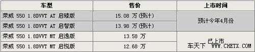 去年的11月26日,上汽荣威正式公布了荣威550 1.8L DVVT两款手动挡车型的价格,分别为550 MT启悦(报价 参数 图片 论坛)版12.68万元(报价 参数 图片 论坛),550S MT启逸版 13.58万元。不过,对于很多消费者来说,更加期待1.8L自动挡车型,尤其对于很多新司机来说。而日前网了解到,荣威550 1.8L DVVT自动挡车型最快将在4月份上市,有启智版和启臻版两款车型,预计售价13.98-15.08万元之间。