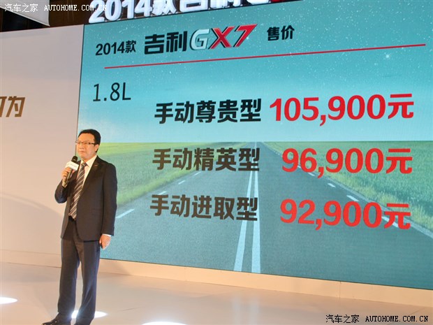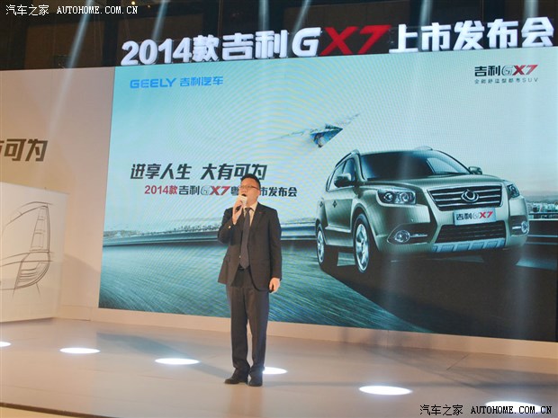 [车天下 广州新闻] 2014款吉利GX7上市发布会于5月13日在广东广州香格里拉酒店上演。据悉,这场以“进享人生·大有可为”为主题的发布会为大家带来吉利GX7 1.8L、2.0L和2.4L三个排量共8款车型,售价区间为9.29~12.99万元(报价 参数 图片 论坛)。作为吉利品牌旗下标志性SUV车型。