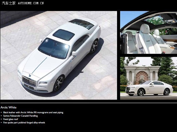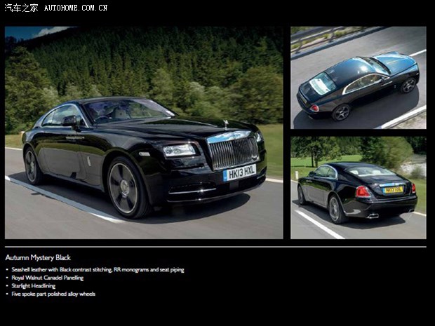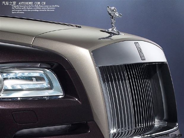 时代所趋,极富魅力。“魅影”(Wraith)一方面继承了新一代幻影(报价 参数 图片 论坛)和古思特(报价 参数 图片 论坛)车型的奢华感,另一方面它又具有自己的特质,动力特征,大胆却又优雅的外观与经典劳斯莱斯设计理念相结合;长发动机罩、短前悬架、长后悬、长轴距和2:1的车轮高度比例。劳斯莱斯首次把飘驰曲线融入车门设计中,其流线型设计能充分彰显魅影独特的动感个性。 新调整,新神韵。进气格栅强劲且优雅的进气格栅与之前相比加深嵌入45毫米,轮廓更加清晰明显,看起来更加锐利强劲。欢庆女神神韵在魅影上有新的展现方式。这次欢庆女神的位置也进行了调整,位置向前移动且倾斜角度加大5度,巧妙地体现了当欢庆女神伫立在风中时魅影的动力指数,女神身影更具神采。