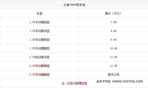 12月28日,众泰T600(报价 参数 图片 论坛) 2.0T MT车型正式于河南省郑州市上市。新车共推出尊贵型和旗舰型两款车型,此次仅公布了起售价为11.38万元(报价 参数 图片 论坛),另一款车型价格尚未公布。与11月上市的2.0T DCT车型相比,2.0T MT车型在外观和内饰上保持了高度一致,只是换装了手动挡的档杆。