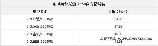 3月10日,东风英菲尼迪QX50(报价 参数 图片 论坛)广州文华汇迪店上市,邀请了众多的新老客户以及媒体见证,QX50一共有四个车型,售价区间为34.98-44.98万元(报价 参数 图片 论坛)。搭载2.5L V6发动机,匹配7速手自一体变速箱,轴距在加长80mm后达到了2880mm。