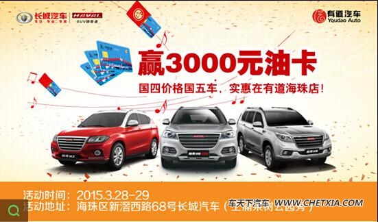 广东有道长城海珠店本周六日月末冲量,我们拥有全省最充足的国五新车货源!国四价格国五车!实惠在有道!凡到店购车即可获得500元(报价 参数 图片 论坛)加油卡!更有机会赢得3000元油卡!详情请到店了解。