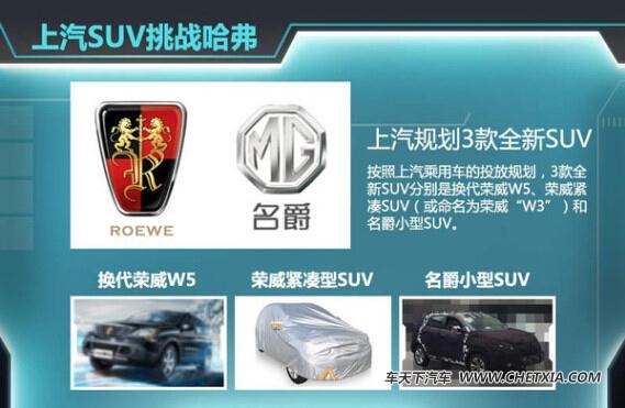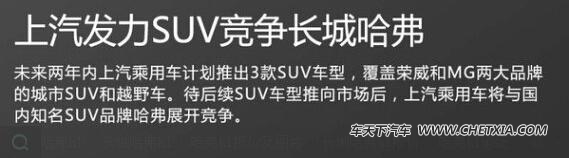 随着上汽乘用车首款城市SUV名爵锐腾(报价 参数 图片 论坛)的推出,正式进军国内主流SUV市场。上汽集团副总裁、上汽乘用车公司总经理王晓秋在接受媒体采访时表示:“面对国内高速增长的SUV市场,上汽乘用车自然不能错过。”同时,上汽乘用车也规划出丰富SUV的产品阵容。日前,媒体从上汽集团内部人士处获悉:未来两年内上汽乘用车计划推出3款SUV,覆盖荣威和MG两大品牌的城市SUV和越野车。待后续SUV车型推向市场后,上汽乘用车将与国内知名SUV品牌哈弗展开竞争。
