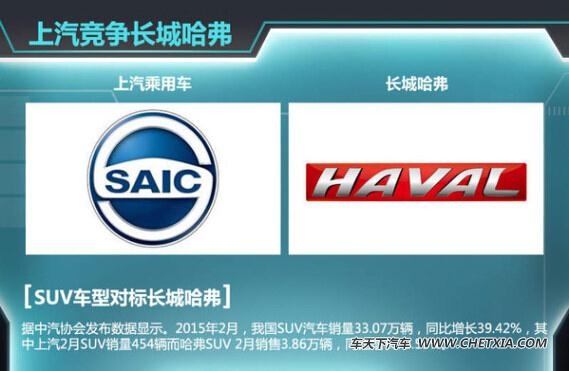 据中汽协会发布数据显示。2015年2月,我国SUV汽车销量33.07万辆,同比增长39.42%,其中上汽2月SUV销量454辆而哈弗SUV 2月销售3.86万辆,同比增长78.55%。这些数据无疑给上汽一记重击,上汽乘用车规划推出的全新SUV上市之后会不会冲击SUV销量第一的哈弗,我们拭目以待。