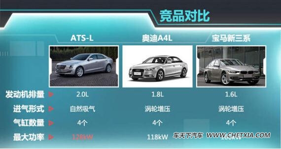国内中型运动轿车市场中,德系豪华品牌的奥迪A4L和宝马3系是凯迪拉克ATS-L主要竞争对手。凯迪卡克此次推出的入门车将继续与上述两款车的入门车竞争。其中A4L搭载一台1.8T发动机,最大功率为118kW,峰值扭矩为250Nm;宝马3系则搭载一台1.6T引擎,最大功率为100kW,峰值扭矩为220Nm。这两台引擎在最大功率上不及ATS-L搭载2.0L自然吸气引擎。