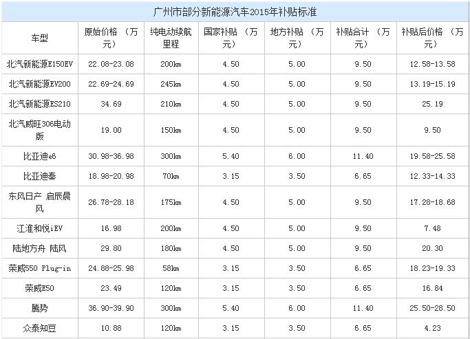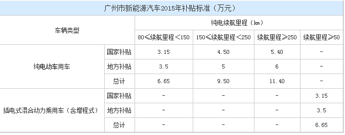 广州市政府在2014年11月公布了《广州市新能源汽车推广应用管理暂行办法》,规定地方财政对车辆购置予以补贴,原则上按照与中央2013年补贴标准1∶1的比例确定最高补贴上限。乘用车的中央和地方财政补贴总额不超过车辆销售价格的60%。2014、2015年地方财政补贴不退坡,也就是说2015年的补贴标准与2013年的补贴标准相同。此外,在此之前购买新能源车,但未享受补贴的,可以进行补贴追溯。具体补贴情况请见下表: