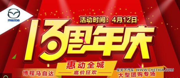 一汽马自达广州博程店13周年店庆将于4月12日在博程店内隆重举行,博程作为广州建店最久的马自达4S店,即将迎来它13周年的纪念日。为了回馈广大新老顾客在13年以来对博程的支持与厚爱,博程店内全系车型走羊城最低价。博程是广州的第一间马自达4S店,你有什么理由相信别人能做的比博程还要好呢。任何优惠都不是空谈,只有实际到手的才叫优惠,另外博程还有八重豪礼等你来拿。