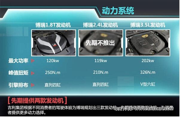 吉利博瑞的动力方面先期推出两款引擎,包括1.8T涡轮增压引擎和3.5L V6引擎。1.8T引擎排布为直列四缸,后者为V型六缸。两款引擎最大功率分别为120kW、202kW;峰值扭矩分别为250Nm、326Nm,两款车都搭配6速手自一体变速箱。后期还将推出2.4L车型,为消费者提供更多动力选择。