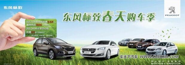 开春之际,为了回馈广大新老客户,同时相应环保低碳、推广小排量汽车的国家政策,2015年4月1日-19日,东风标致特推出“春天购车季”活动。国五东风标致508(报价 参数 图片 论坛)尊享版钜惠3.5万起,置换更可享3000返现,国五3008全景劲动版优惠2万起。此优惠仅限现车哦!