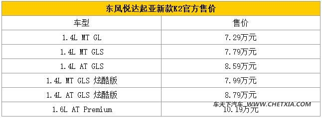 2015年4月8日,东风悦达起亚(微博) 宣布新款两厢K2上市,售价区间为:7.29万-10.19万(报价 参数 图片 论坛)。