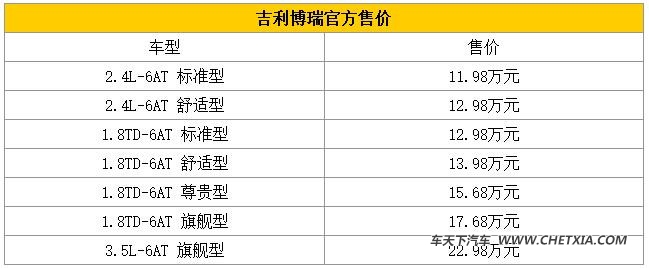 [导读] 2015年4月9日,吉利汽车宣布旗下全新旗舰车型吉利博瑞正式上市,官方售价为11.98-22.98万元,此次推出2.4L、1.8T、3.5L三种排量共7款车型。