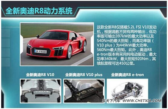 全新一代R8采用ASF全铝车身技术,同时多部位使用碳纤维复合材料(CFRP),新车的整车质量仅为1454公斤,比现款减轻了100斤。尽管重量更轻,但新车采用全新的空气动力学设计可提供足够下压力,车身动态稳定性不会因为重量原因而变差。动力方面,新车型搭载了5.2L FSI V10发动机,根据调教不同有两种输出,低功率版可输出397kW的最大功率以及540Nm的最大扭矩,而高功率版(V10 plus)为449kW最大功率、560Nm最大扭矩,与之匹配的是升级的7速S tronic变速箱。