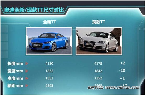 第三代奥迪TT(报价 参数 图片 论坛)基于大众MQB平台打造,与高尔夫(报价 参数 图片 论坛)7和新奥迪A3(报价 参数 图片 论坛)为共享平台。由于新车型大量使用了铝制材料,其在车身重量上较老款轻了100斤,进一步提升了新车的操控性和燃油经济性。动力方面,全新奥迪TT除了会继续保留为欧洲市场服务的2.0L TDI柴油发动机,还将搭载经过全新调校、动力升级的2.0L TF(报价 参数 图片 论坛)SI引擎。此次新TT所装备的2.0TFSI发动机最大输出功率为169kW,比现款增加了14kW;峰值扭矩提升了20 N m,能够在1,600—4,300rpm之间输出最高达370 N m的扭矩,且百公里加速时间最快仅需5.3秒。