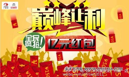 值此年度盛会,广物汽贸东风雪铁龙携手各大团购网共襄年度盛举,广发钜惠。于2015年4月18日14时隆重举行“巅峰让利全民疯抢亿元红包“闭店抢购活动。活动期间,购东风雪铁龙全系车型可享广物雪铁龙盛典钜惠,第一轮微信红包到店即派!
