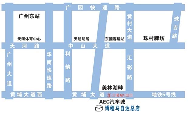 交通方式一:地铁5号线三溪站C出口,到斜对面马路AEC汽车城内博程马自达4S店。