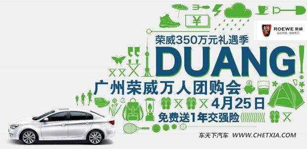 上汽荣威2015年全国万人团购会——广州站(4月25日)再度迅猛来袭,一举“砸烂”五一价!保证广东省最低,比肩全国最低!活动当日,现场交100元(报价 参数 图片 论坛)立抵1000元,直接折让车价!还送一年交强险!