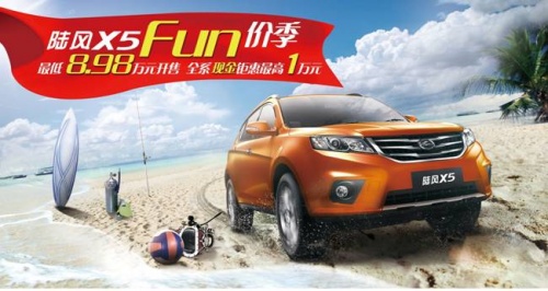 2015年4月19日到6月30日期间,凡购买陆风X5(报价 参数 图片 论坛)系列车型,将可享受最高10000元(报价 参数 图片 论坛)的购车优惠,最低仅需89800元即可让你提前拥有属于自己的爱车。