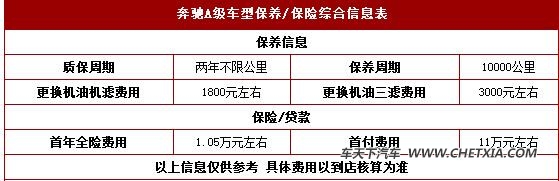 金融政策:保险方面,以售价为25.2万的A180风尚(报价 参数 图片 论坛)版车型为例,新车第一年保险费用在1.05万元左右。贷款方面,按央行基准利率首付30%三年期计算,首付11万元左右(包含车款、上牌、保险、购置税和担保金等),月供5500元左右。具体费用根据车型以到店核算为准。