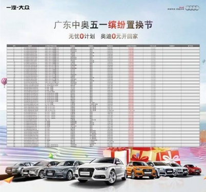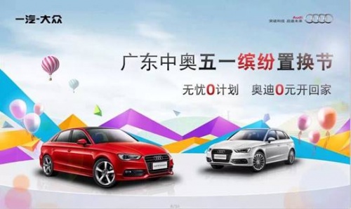活动期间,奥迪车型厂家特卖,广东中奥特推65台奥迪特价车,预购请从速,机不可失,时不再来,活动期间最高享7折优惠,您还在犹豫什么?5月1日-5月4日欢迎莅临广东中奥展厅莅临选购。