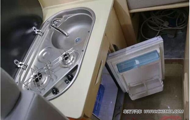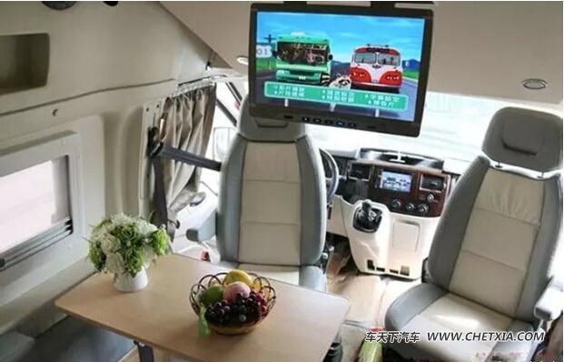 活动餐桌,驾驶员座椅后部固定多功能厨柜,车身后部设置卫生专用设施、会议桌、卧具柜,车内设置音响、电视、装饰灯等娱乐设施。