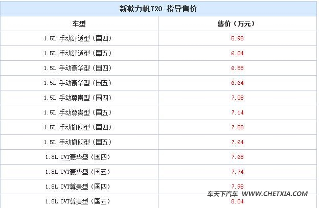 日前,力帆汽车正式宣布新款力帆720(报价 参数 图片 论坛)正式上市,新车共推出两种排量共计12款车型,新车的售价区间为5.98-8.04万(报价 参数 图片 论坛)。