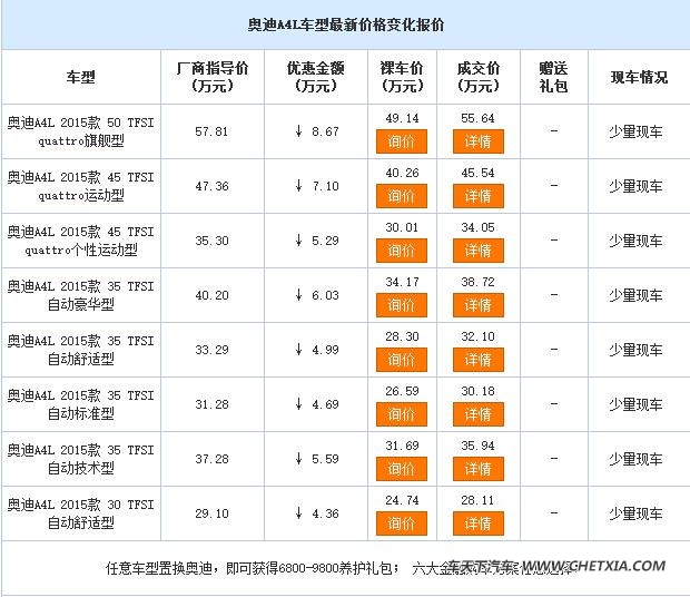 [导读] 近日,本店内奥迪A4L现车销售,颜色可选,目前购车部分车型可优惠8.67万元,感兴趣的朋友可以到店咨询购买,详情见下表:        任意车型置换奥迪,即可获得6800-9800养护礼包;六大