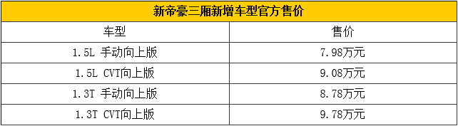 近日,吉利新帝豪(报价 参数 图片 论坛)(参配、图片、询价) 三厢版增4款配置,售价区间为:7.98万-9.78万。
