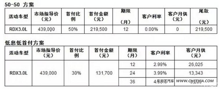 RDX3.0L精英版官方指导价为43.9万元(报价 参数 图片 论坛),消费者可享有“零息50-50”和“低息低首付”两款产品的多套信贷方案,不仅令购车方式更加灵活自由,更节省了消费者的购车利息支出。“零息50-50”金融产品,首付50%,即可享受12期内0利率,0利息,0月供,到期后付清剩余50%尾款即可。“低息低首付”金融产品首付比例30%,有12期、24期和36期方案选择,客户负担利率分别是2.99%、3.99%、4.99%,其相应月供为26025元、13343元和9209元。对于为事业和家庭不断打拼的城市年轻精英而言,如此诱人的金融方案不仅最大限度的降低了购车压力,也更加符合新一代年轻人群的消费习惯,令他们更加灵活的支配手中资金,即刻享受优质而惬意的精彩生活。