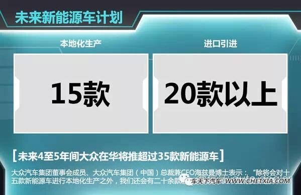 根据海兹曼博士所透露的大众汽车集团在华新能源车计划,到2019年至2020年,该集团将有15款新能源车型实现在华投产。与此同时,还将以进口的形式向中国引进20余款进口新能源车。总的来说,大众汽车集团在4到5年后将有超过35款新能源汽车产品投放到中国市场当中。此外,由于插电式混合动力车在使用当中的便利性和可靠性,在中短期最适合中国市场。换言之,在中短期,大众汽车集团在中国市场仍旧会主推插电式混合动力车。