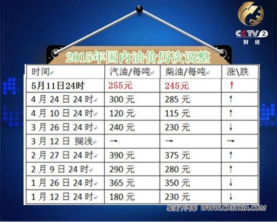5月11日,国内油价迎来年内三连涨。汽柴油每吨上调255(报价 参数 图片 论坛)、245元,调价执行时间为5月12日0时。