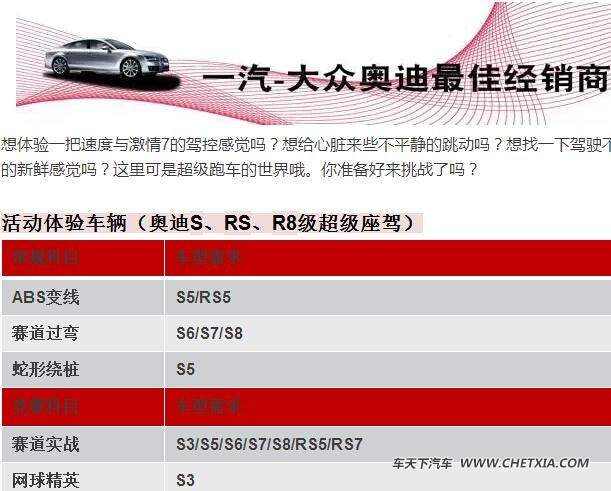 2015奥迪驾控汇详情活动主题:2015年奥迪珠海驾控汇活动时间:6月5日-6月10日活动地点:珠海国际赛车场(名额有限,如需参加请尽快报名!)参与报名的客户注意事项: