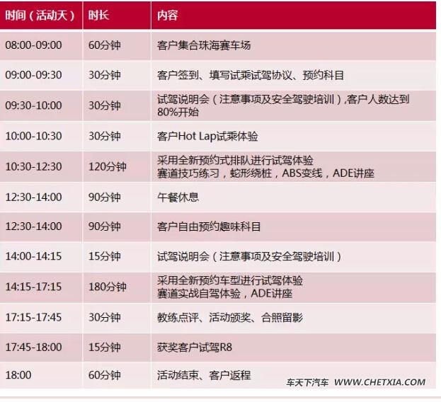 [导读] 活动进程 专业培训(上午) nABS变线 体验在一定速度时,不刹车变线与刹车变线 n赛道过弯 体验过弯速度感与高速进弯出弯技巧 n蛇形绕桩 体验变换方向时车身稳定性 趣味竞赛(中午) n网球精英 在规定区域里,在4个球点自由采集选择3个网球,以计时方式比赛 赛道体验(下午) n客户赛道高速实战驾控体验 活动详情 2015奥迪驾控汇详情活动主题:2015年奥迪珠海驾控汇活动时间:6月5日-6月10日活动地点:珠海国际赛车场(名额有限,如需参加请尽快报名!)参与报名的客户注意事项: 1、必须携带驾驶证,否则不给予试驾,只能试乘。