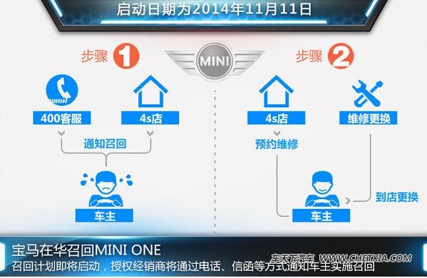 对于此次召回事件的相关信息,网通社以消费者的身份致电MINI客户服务中心官方400服务热线并进行咨询。对方表示:已收到厂商召回通知,召回计划将于2014年11月11日启动,MINI授权经销商将以电话、短信等方式通知车主实施召回。车主也可拨打官方客户服务热线,并提供车辆的车架号,以确认车辆是否涉及此次召回。