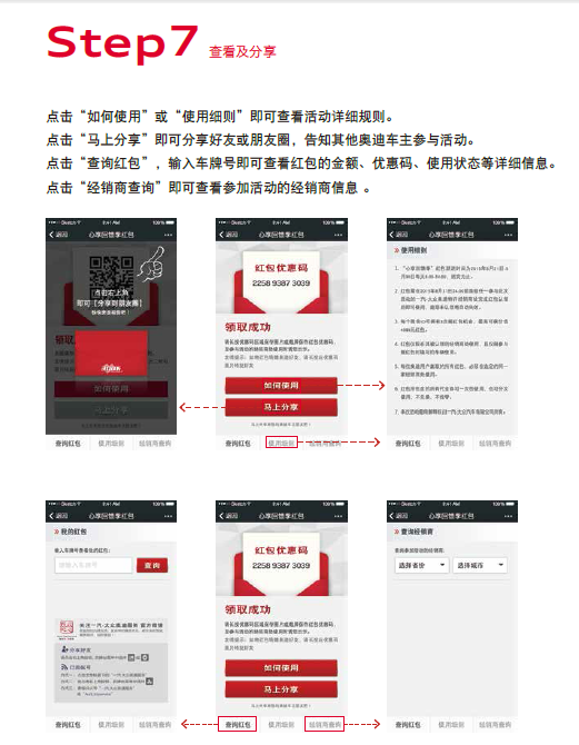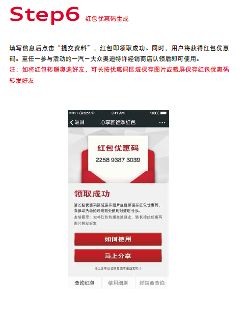 奥迪用户持红包优惠码,至广州锦龙奥迪处进行认领后即可使用。红包仅限奥迪车主使用。