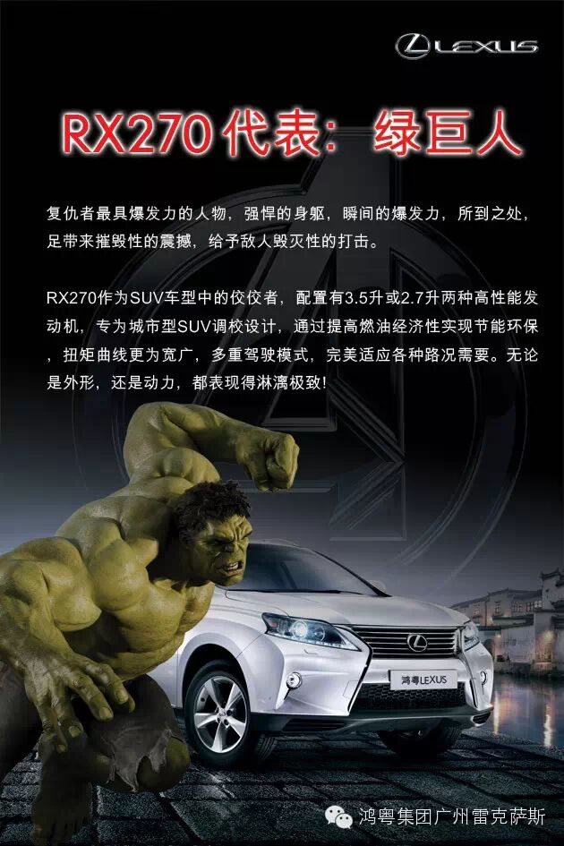 [导读] 【LEXUS雷克萨斯之复仇者纪录片】5月23日隆重上映 鸿粤集团广州雷克萨斯 微信号hy_lexus 欢迎关注广东鸿粤汽车销售集团,广州鸿粤雷克萨斯汽车销售服务有限公司,公司主要经营雷克萨斯品牌,为客户提供整车销售,整车售后,零配件供应、汽车用品研发等服务,欢迎品鉴。