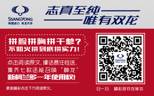 欢迎关注双龙汽车中国官方微信,双龙汽车公司(SSANG YONG Motor Company)附属韩国双龙集团,是以制造四轮驱动汽车为主,是世界第三大专业SUV生产商。欢迎阁下光临各地双龙4S店试驾体验!