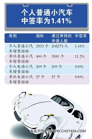 据悉,第四期摇号摇出了4类增量指标,其中包括,个人普通小汽车增量指标:指标2933个,共204694人通过审核,中签率约为1.41%;单位普通小汽车增量指标:指标400个,共3581个通过审核,中签率为11.2%。