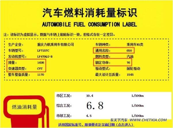 我们看到新车的燃料消耗标识表中,该款车的通用名称为650,这款车搭载1.5L发动机,其最大功率为103马力,与发动机匹配的是CVT变速箱。图表中显示的新车平均油耗为6.8L/100km。
