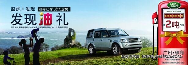 2015年6月8日-30日期间,到广东中汽南方订购路虎发现汽油版即可参加发现“油”礼活动,成功购车即可获赠汽油2吨油礼!中汽南方天河店、石牌店、珠海店同时进行!