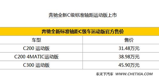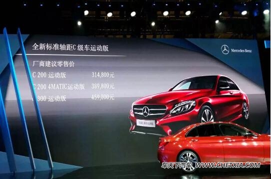 6月6日,在2015深港澳车展上,北京奔驰旗下多款奔驰C级(报价 参数 图片 论坛)新车型正式上市。上市的车型包括三款标准轴距版本的奔驰C级,它们分别是C 200运动版、C 200 4MATIC运动版、C 300运动型,这是标准轴距版奔驰C级首次登陆中国市场,而标准轴距三款车型售价区间为31.48-45.90万元(报价 参数 图片 论坛)。
