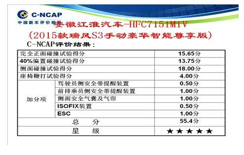 近日,中国汽车技术研究中心正式公布了2015年度第一批C-NCAP碰撞测试的结果。其中,江淮乘用车首款小型SUV瑞风S3(报价 参数 图片 论坛)以总分55.4分的优秀成绩获得五星评价,这是继和悦(报价 参数 图片 论坛)三厢、和悦A30(报价 参数 图片 论坛)、瑞风S5(报价 参数 图片 论坛),江淮又一款车型获得C-NCAP五星评价。而瑞风(报价 参数 图片 论坛)S3在C-NCAP测试中的高水准表现,也为其超过10万用户献上一份大礼,让这款小型SUV市场销冠车型的用户们用车更安心、舒心。