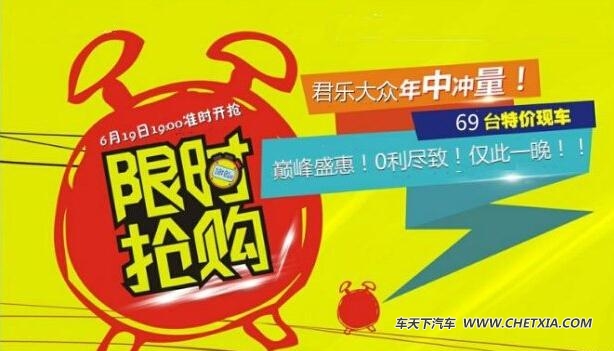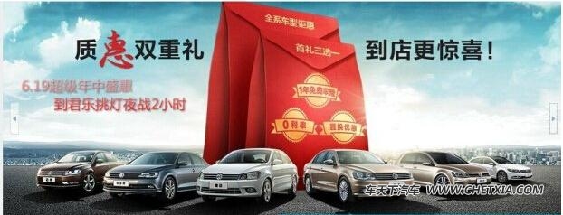迈腾(报价 参数 图片 论坛)、速腾(报价 参数 图片 论坛)、捷达(报价 参数 图片 论坛)、宝来(报价 参数 图片 论坛)、高尔夫(报价 参数 图片 论坛)、CC大牌车型任你挑选,价格钜惠空前,给你带来了一个夏季爽到爆的购车盛宴,6月19日晚19:00-21:00各位车友们我们在广东君乐4S店等你!不见不散!