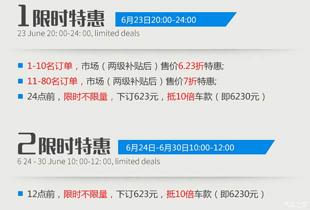 本次电商平台上市还将启动”618之后,再看623”的限时秒杀活动,共有100辆知豆D2供消费者限时抢购。在6月23日上市当天的20:00-24:00之间,消费者可通过参与秒杀活动,抢购享受国家和地方城市双重补贴后的6.23折与7折购车特权。此外,在当天24点前,消费者只需交付623元(报价 参数 图片 论坛)订金,即可享受预付款抵10倍车款(即6230元)的不限量特惠购车活动。