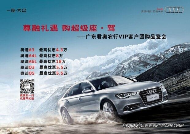 [导读] 作为社会责任、创新思想和进取之心的象征,奥迪一直深受社会菁英青睐,广东君奥6月27日,携手农行举办VIP客户团购品鉴会,奥迪最高优惠18万,多种金融优惠政策,解决您的后顾之忧。