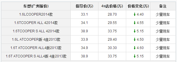 近日,根据进口MINI(报价 参数 图片 论坛)品牌广州地区授权经销商透露,现阶段下订购买13/14款MINI PACEMAN全系任一款车型的客户,最高可享受5.15万(报价 参数 图片 论坛)的现金优惠,折合最低裸车价为28.7万元。到店可以了解更多优惠内容!店内库存现车数量有限,颜色可选!感兴趣的朋友不妨到店详询!具体车型以及价格如下:
