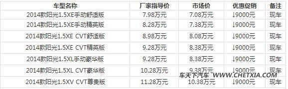 编辑从东风日产专营店了解到,目前店内阳光(报价 参数 图片 论坛)现车充足、颜色齐全,购车享受9000(报价 参数 图片 论坛)的现金优惠。感兴趣的朋友不妨关注下,车型信息详见下表: