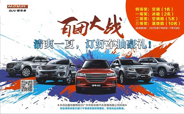 [导读] 百团大战——清爽一夏,订好车抽豪礼TO:准备购车的你年中第一次团购活动,百团大战启动会,你不该错过!【为什么?】团购,已经成为哈弗的头牌活动。