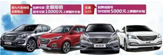 省!购第九代索纳塔(报价 参数 图片 论坛)或15款全新胜达(报价 参数 图片 论坛),在享超值优惠基础上,广州拍牌全额报销费用;摇号也有万元现金补贴!