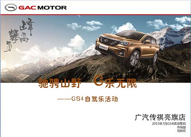 广汽传祺亮旗4S店将于2015年7月26号星期日举办“驰骋山野 G乐无限-亮旗GS4自驾乐活动”,凡在我亮旗店购买广汽传祺GS4(报价 参数 图片 论坛)的新老客户均可报名参加。