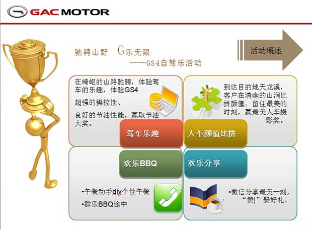 2、使用户在独到新颖的活动中亲身体验GS4汽车的高性能、高省油性,达到自然的口碑广告宣传效果,有力地补充推广的广告宣传渠道。